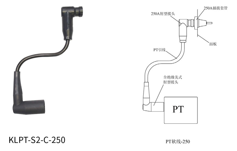 產(chǎn)品說明:主要用于一端是 PT,另一端是屏蔽型 250A 插拔套管的軟連接,使用可代替電纜連接的 PT 線來實(shí)現(xiàn)產(chǎn)品電氣連接的全絕緣、全密封。